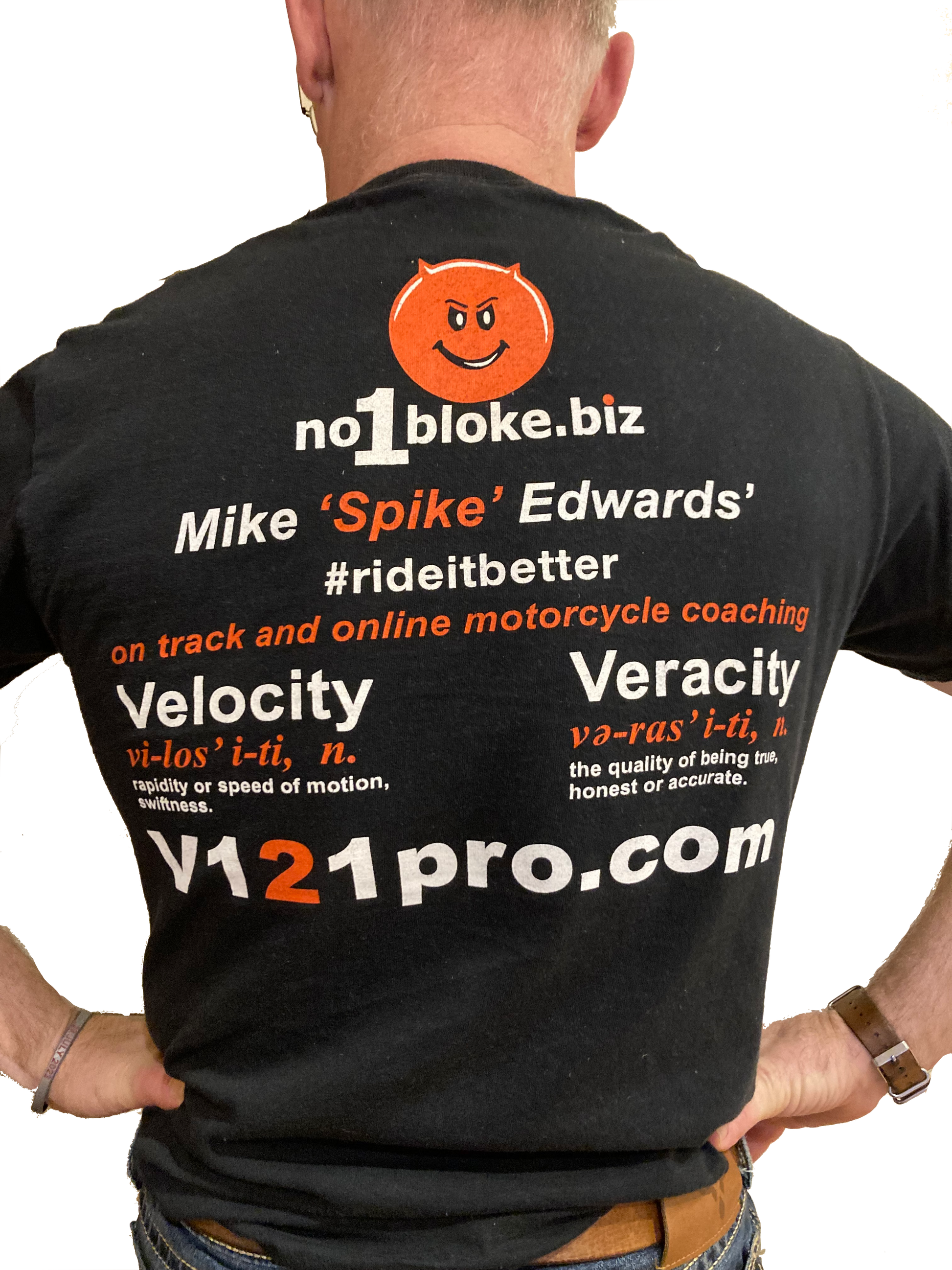 'Velocity' 'Veracity' mantra motorcycle coaching V121PRO T shirt.