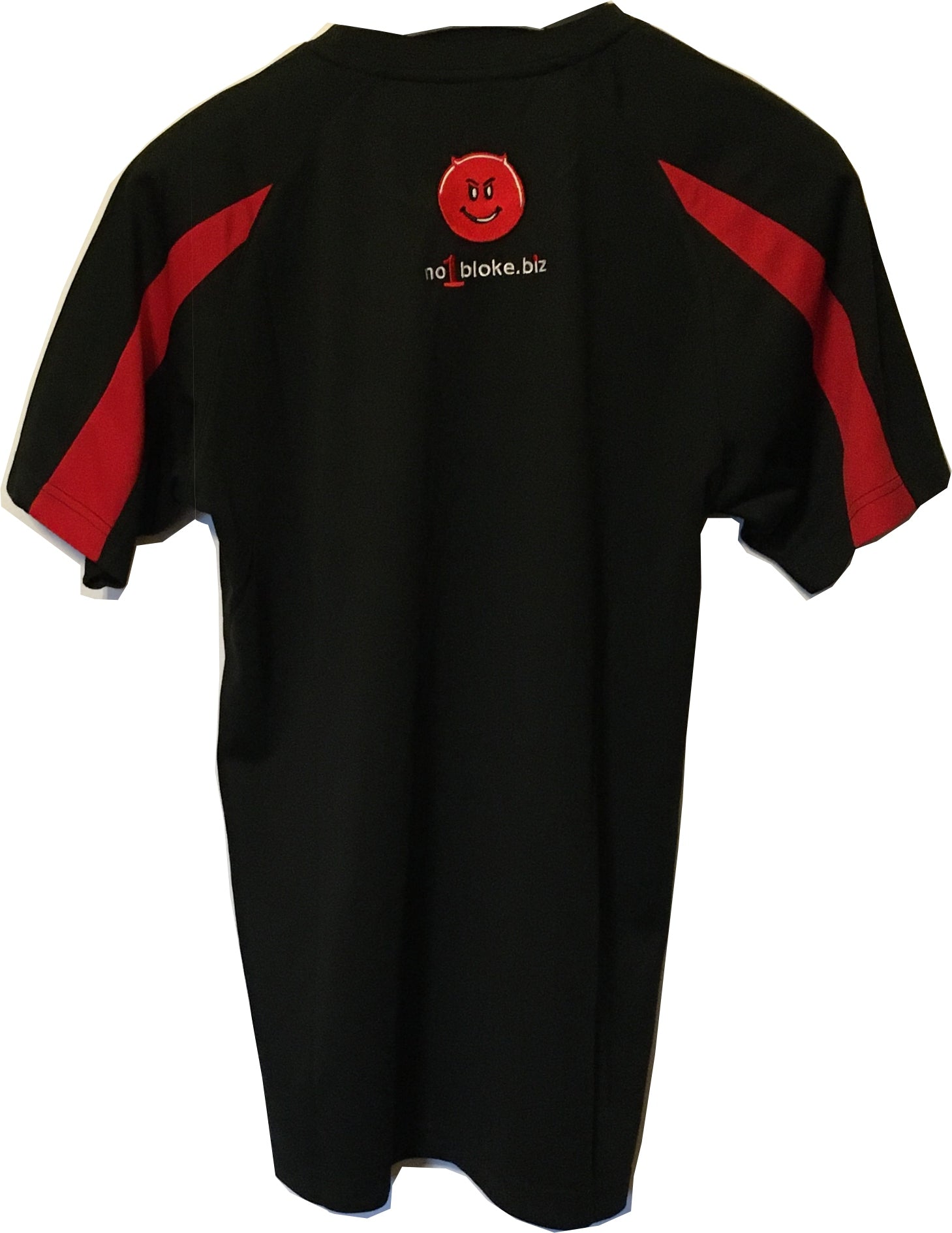 Black Sports shirt, performance fabric, embroidered with No1Bloke logo on back of the neck.