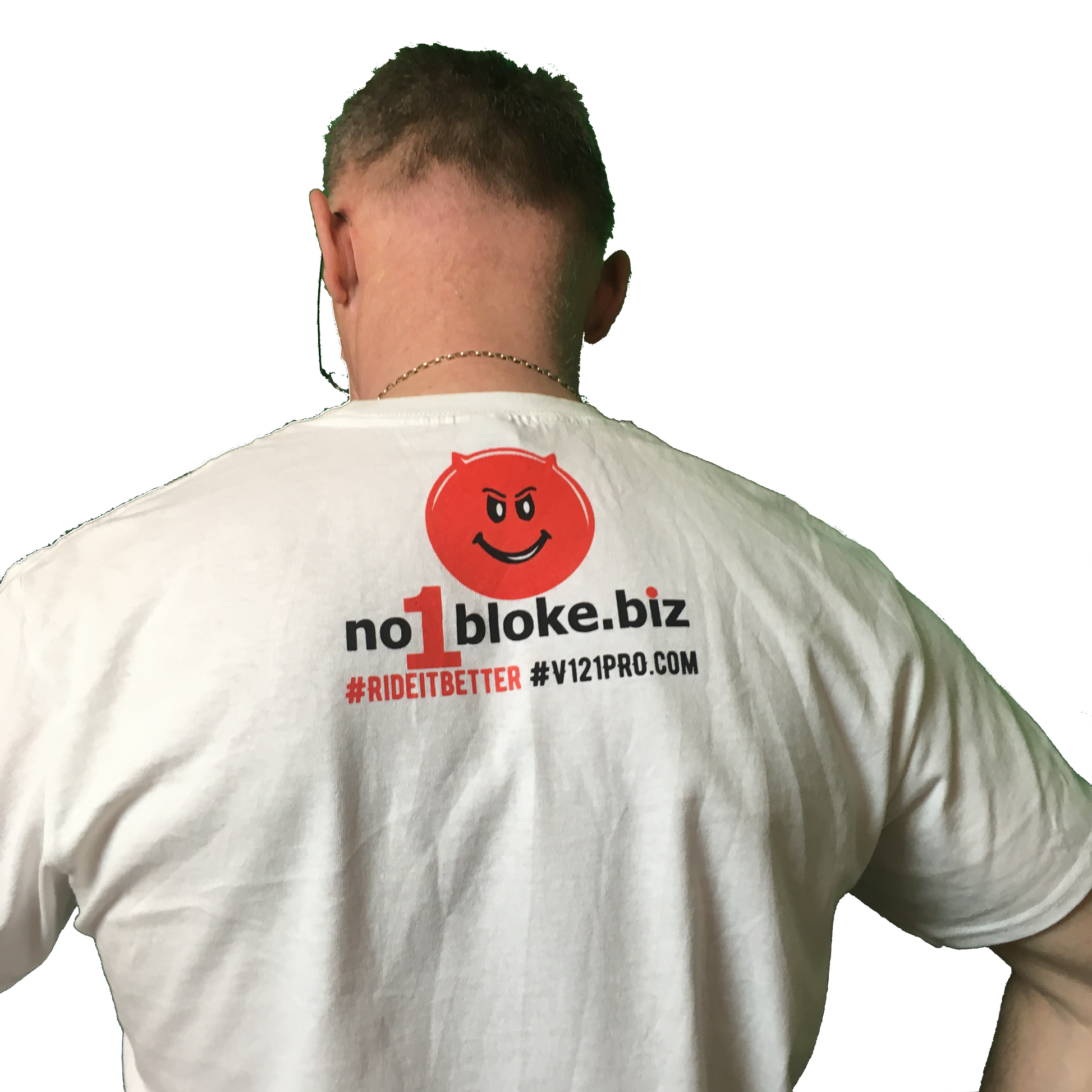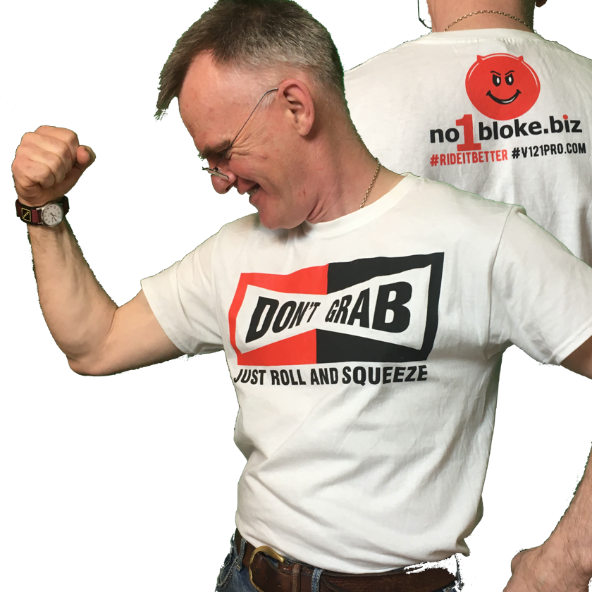 Two colour red/black design on white Gildan heavy t-shirt - featuring Mike 'Spike' Edwards' 'don't grab - just roll and squeeze' braking mantra.