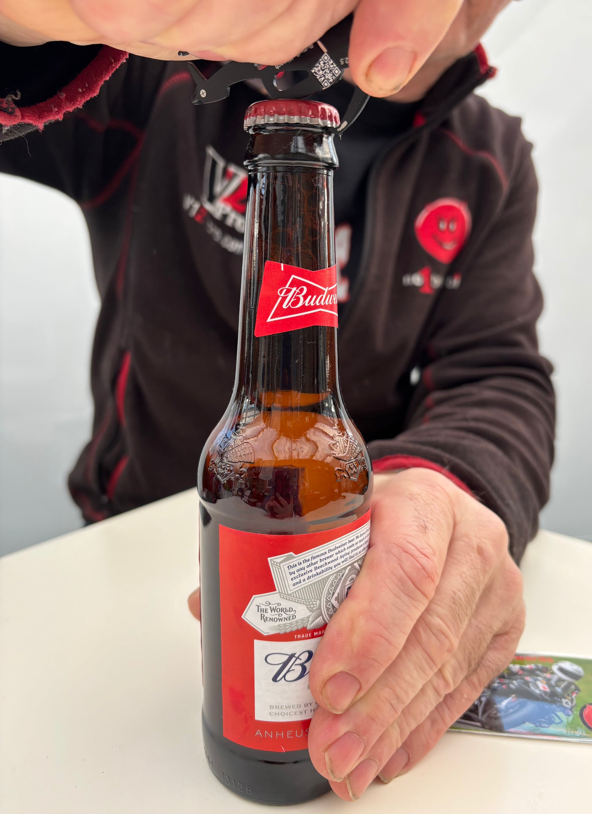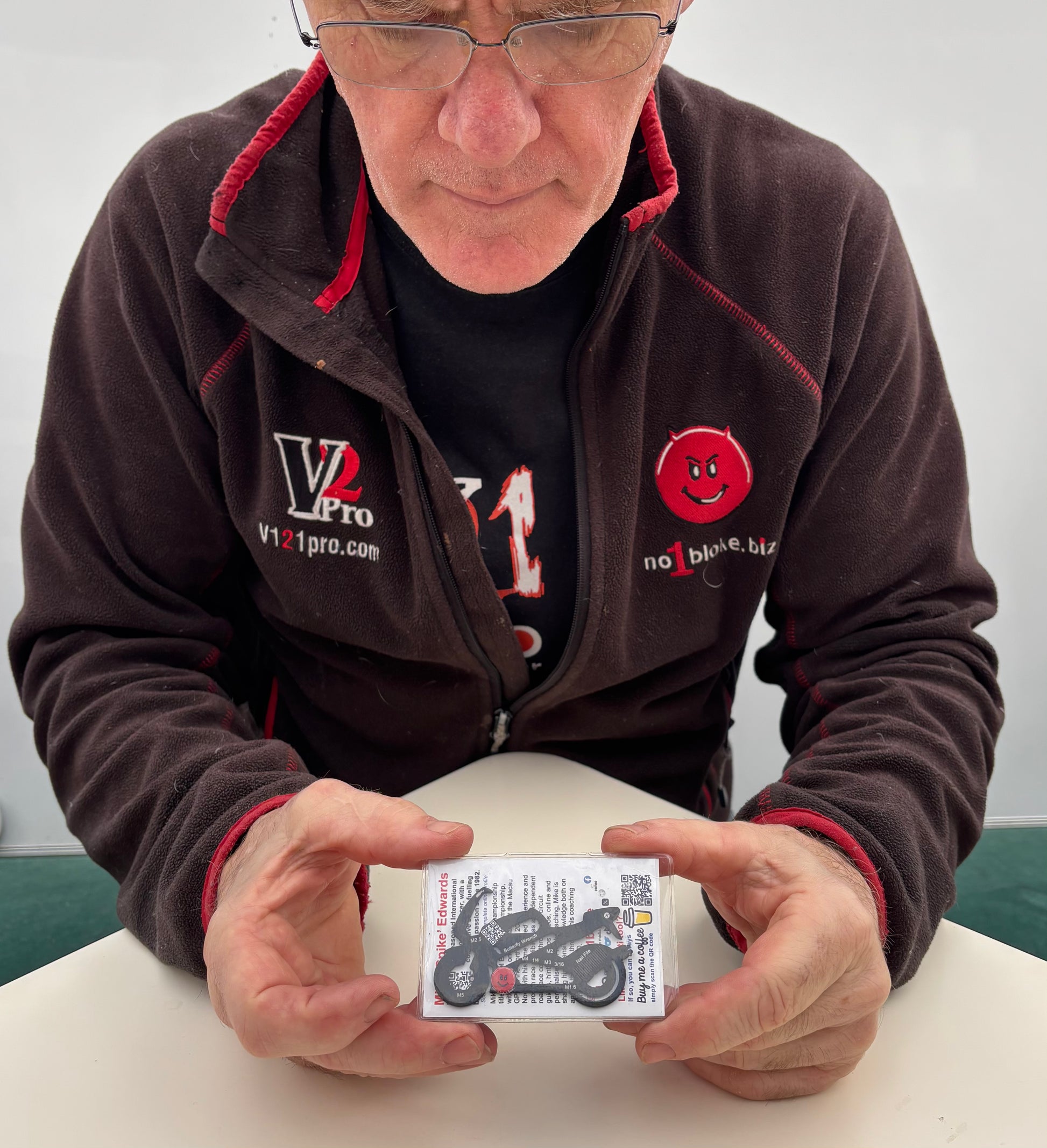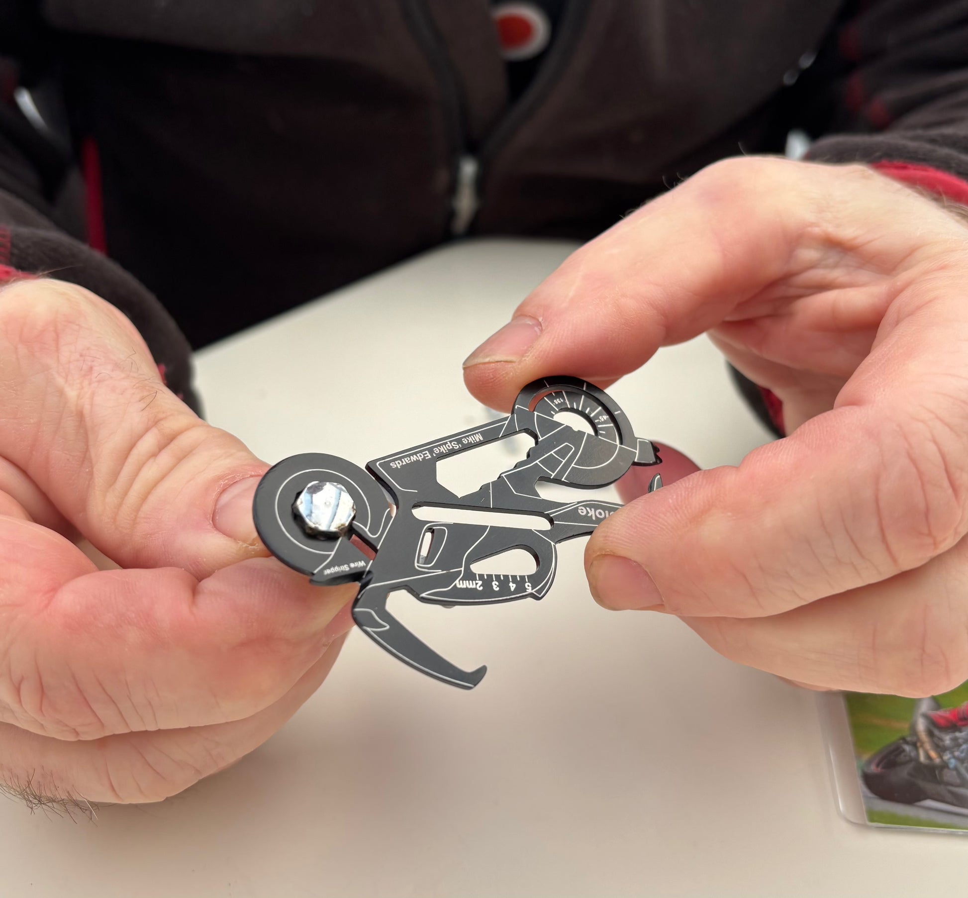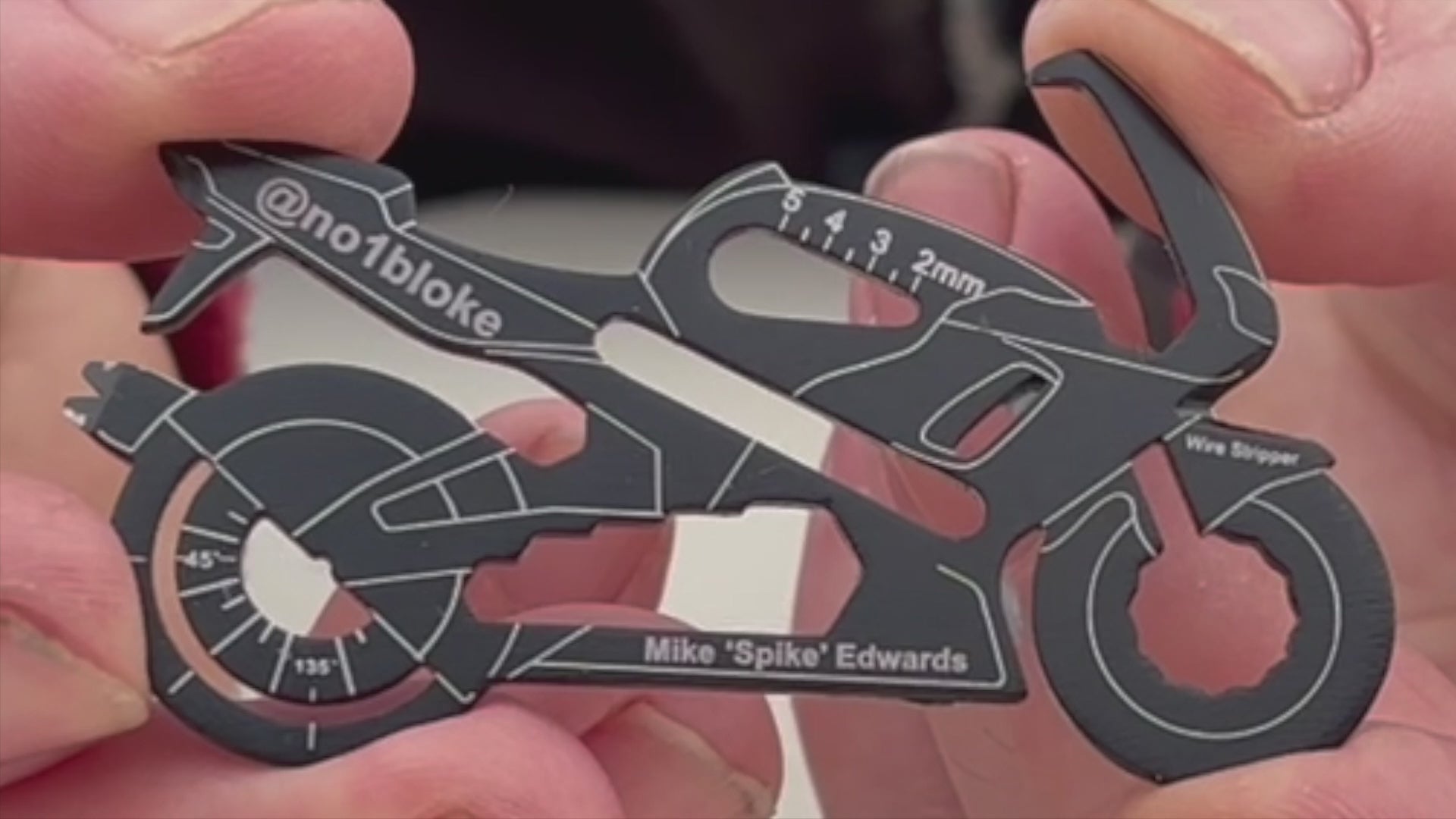 Motorcycle shaped credit card sized multi tool - presented in a full colour signed '2024 bikes ridden' feature card.