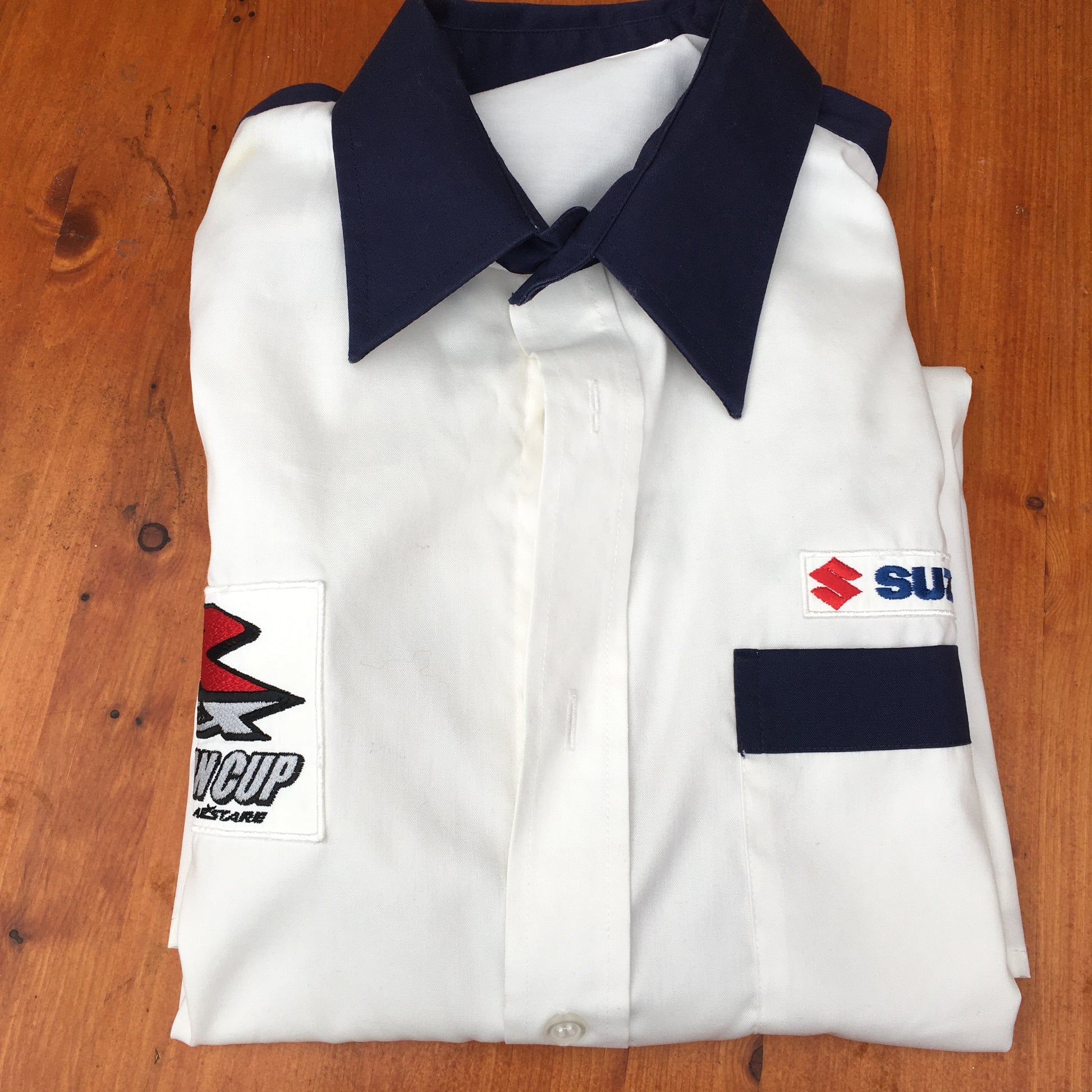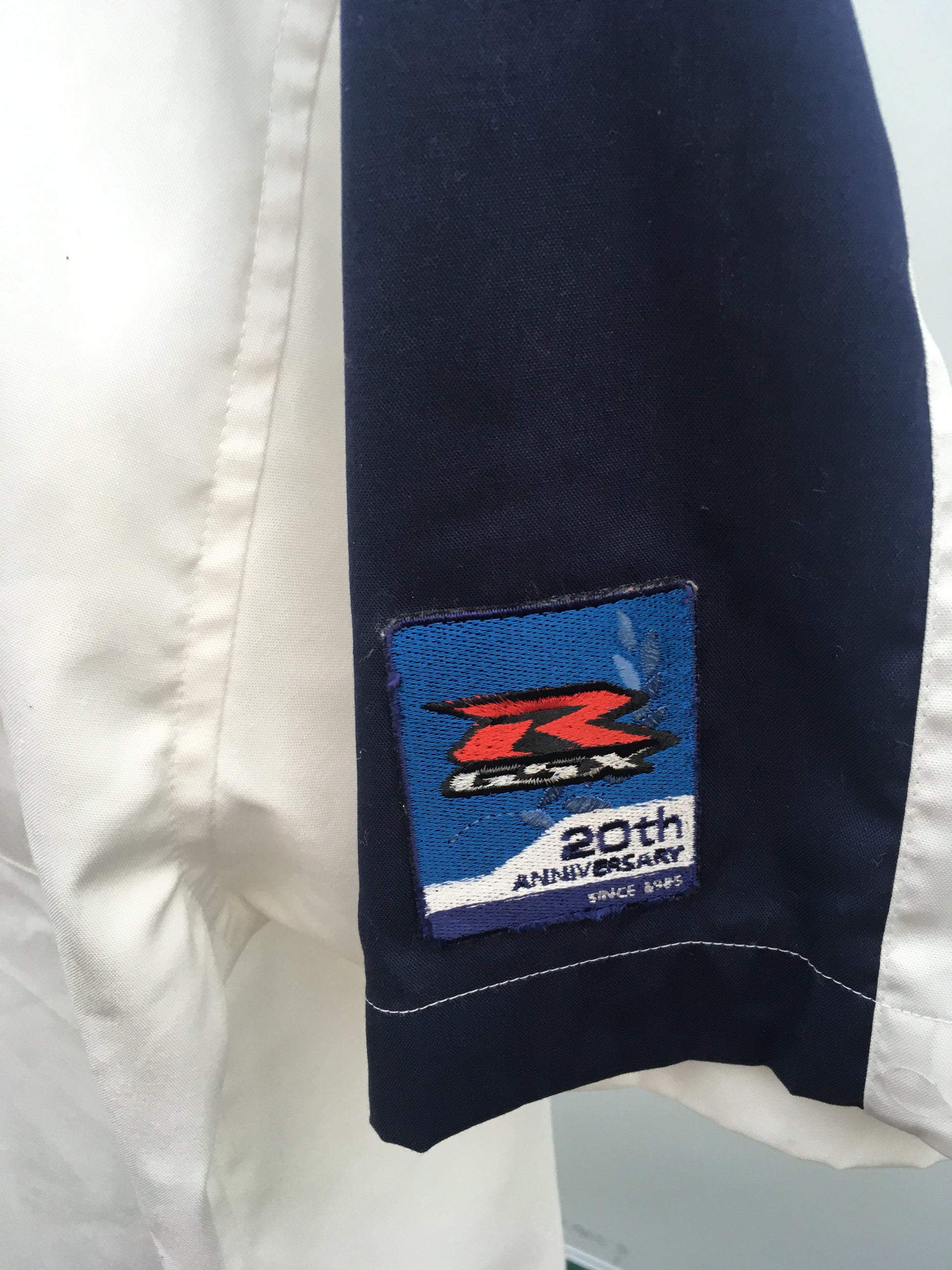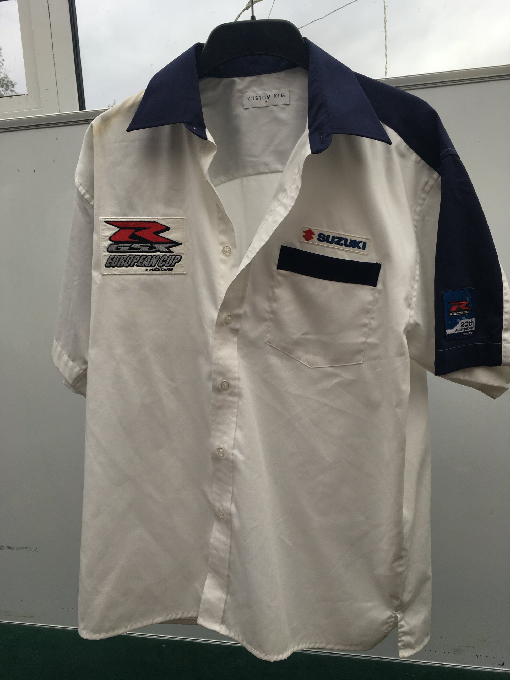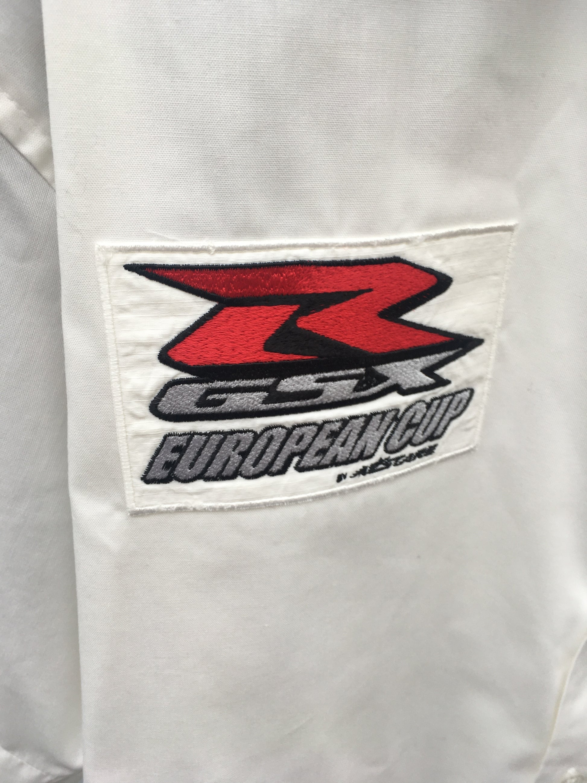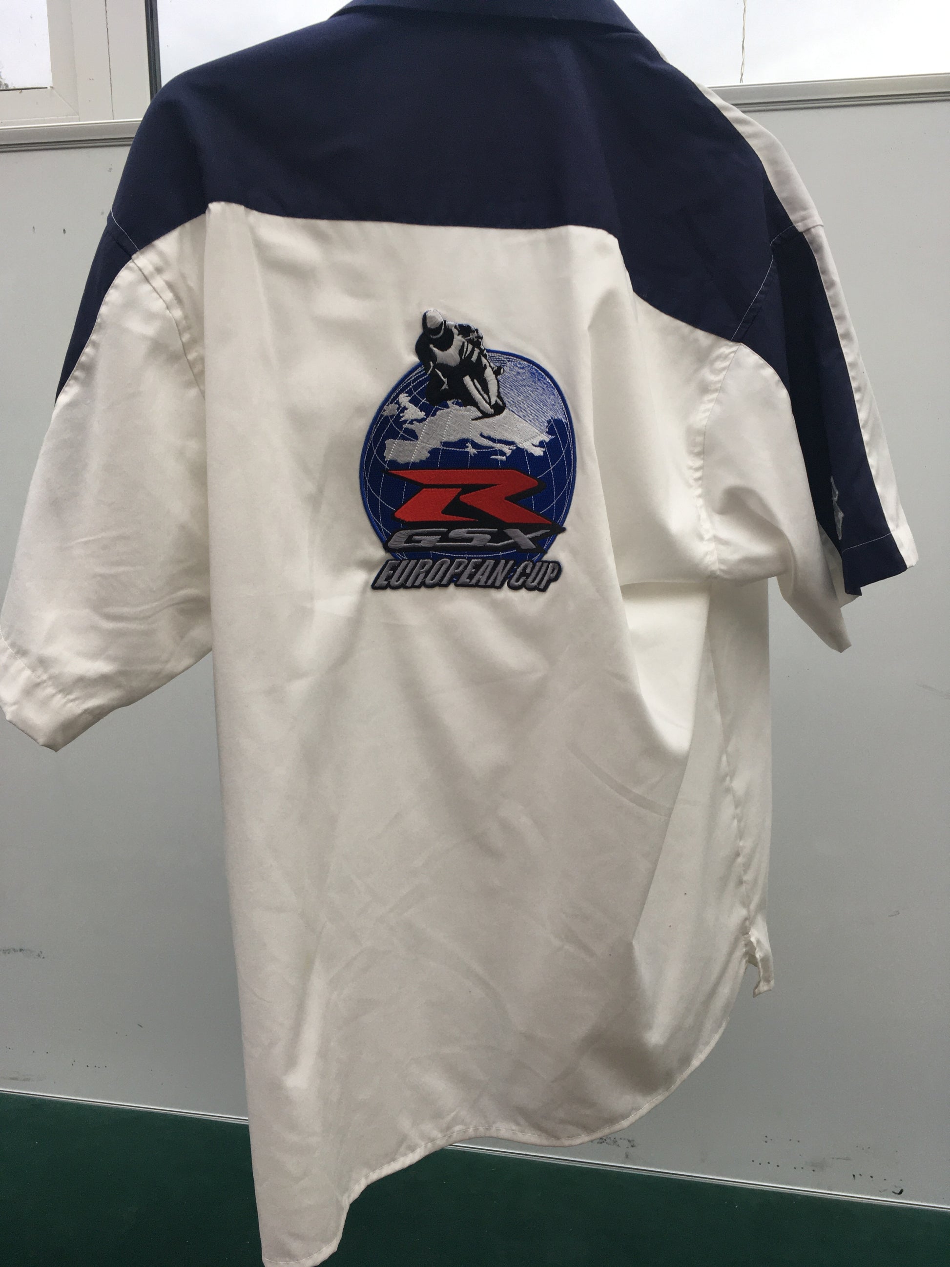 Motorsport memorabilia motorcycle team shirt - GSXR European Cup Suzuki embroidery of logos is front, collar and back some embroidery as iron on badges.