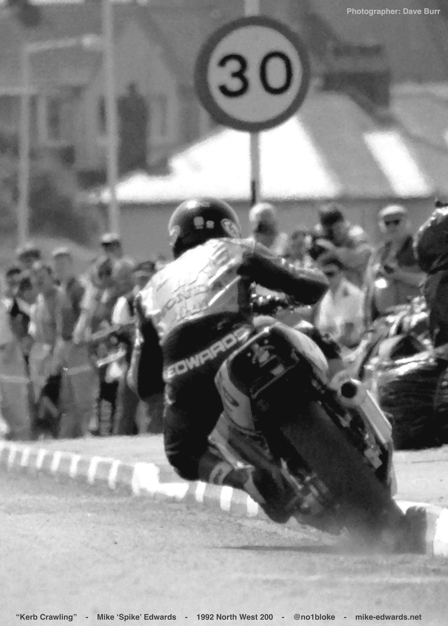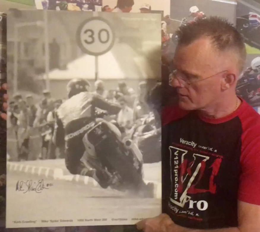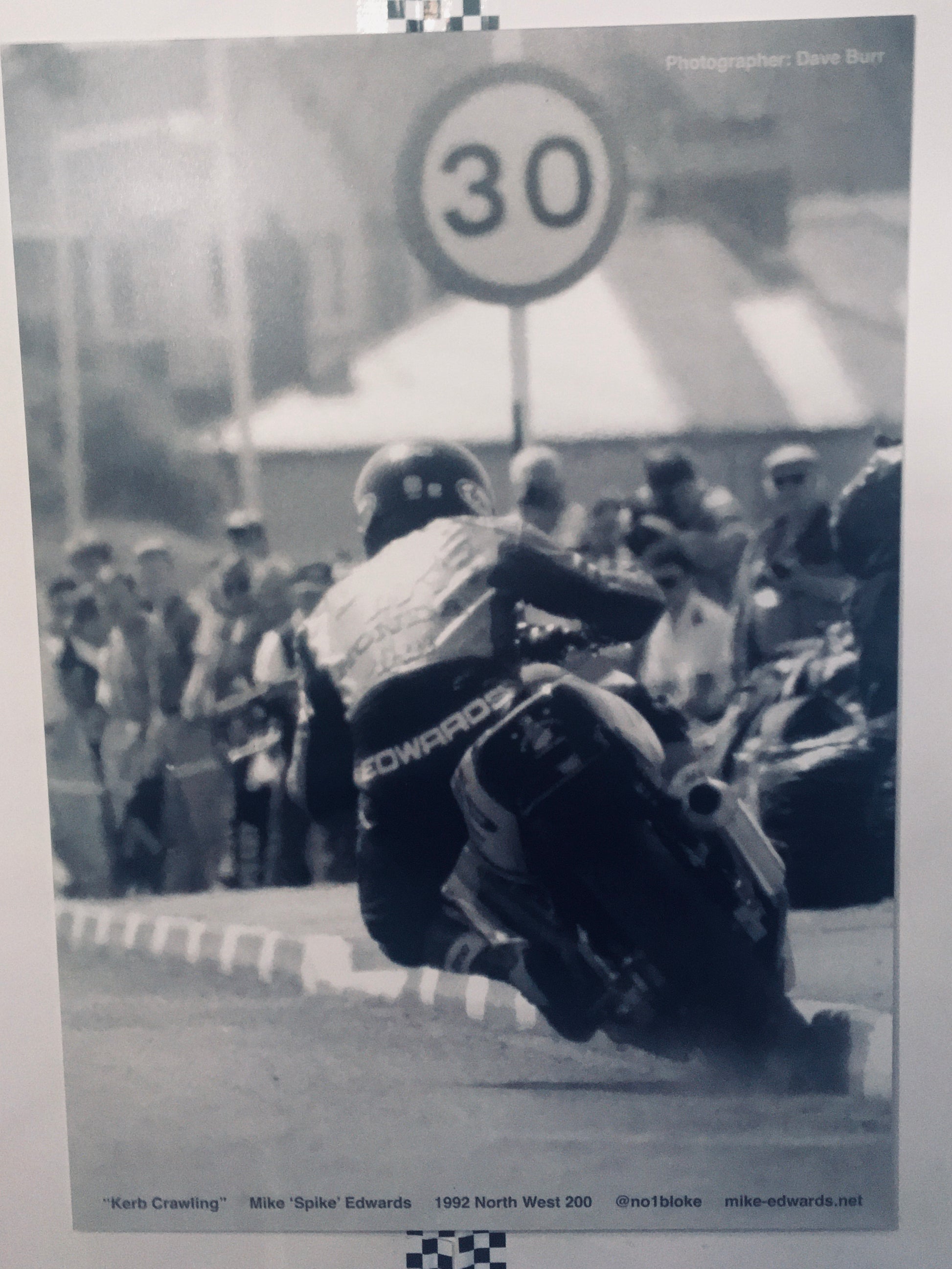 70cm x 50cm printed on 3mm foam board featuring Mike 'Spike' Edwards racing the Magic Wheels CBR 600 - 'riding the berm'.