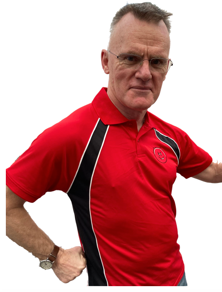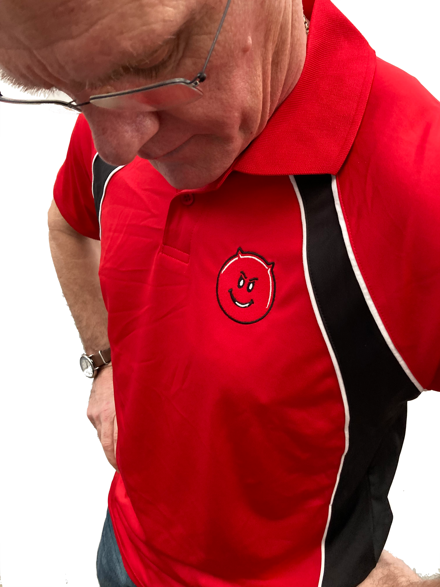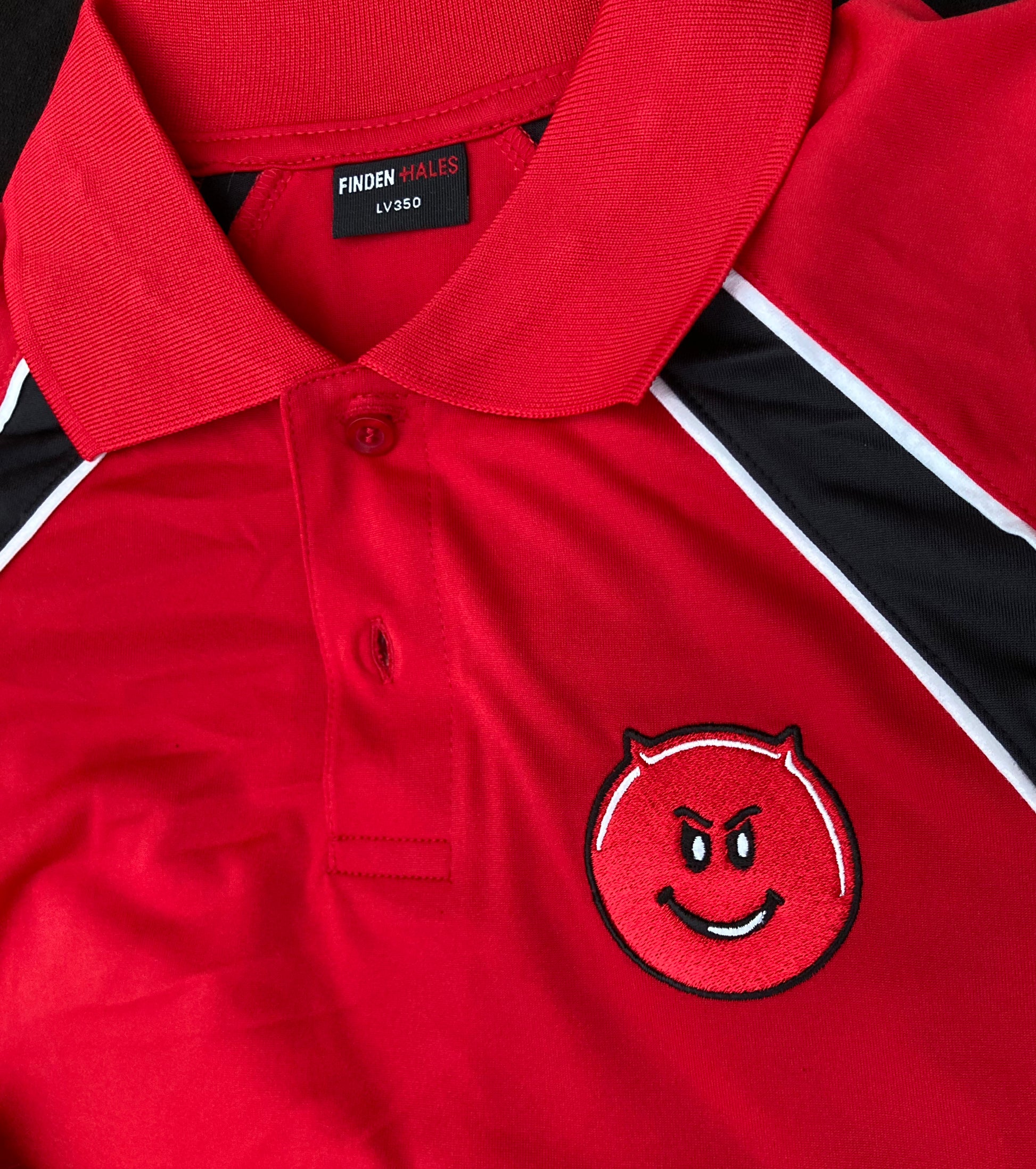 Performance Sports polo shirt - red with black and white trim - quality embroidered logo - performance leisure shirt, with branded 'cheeky devil' embroidered emblem on left breast pocket area.