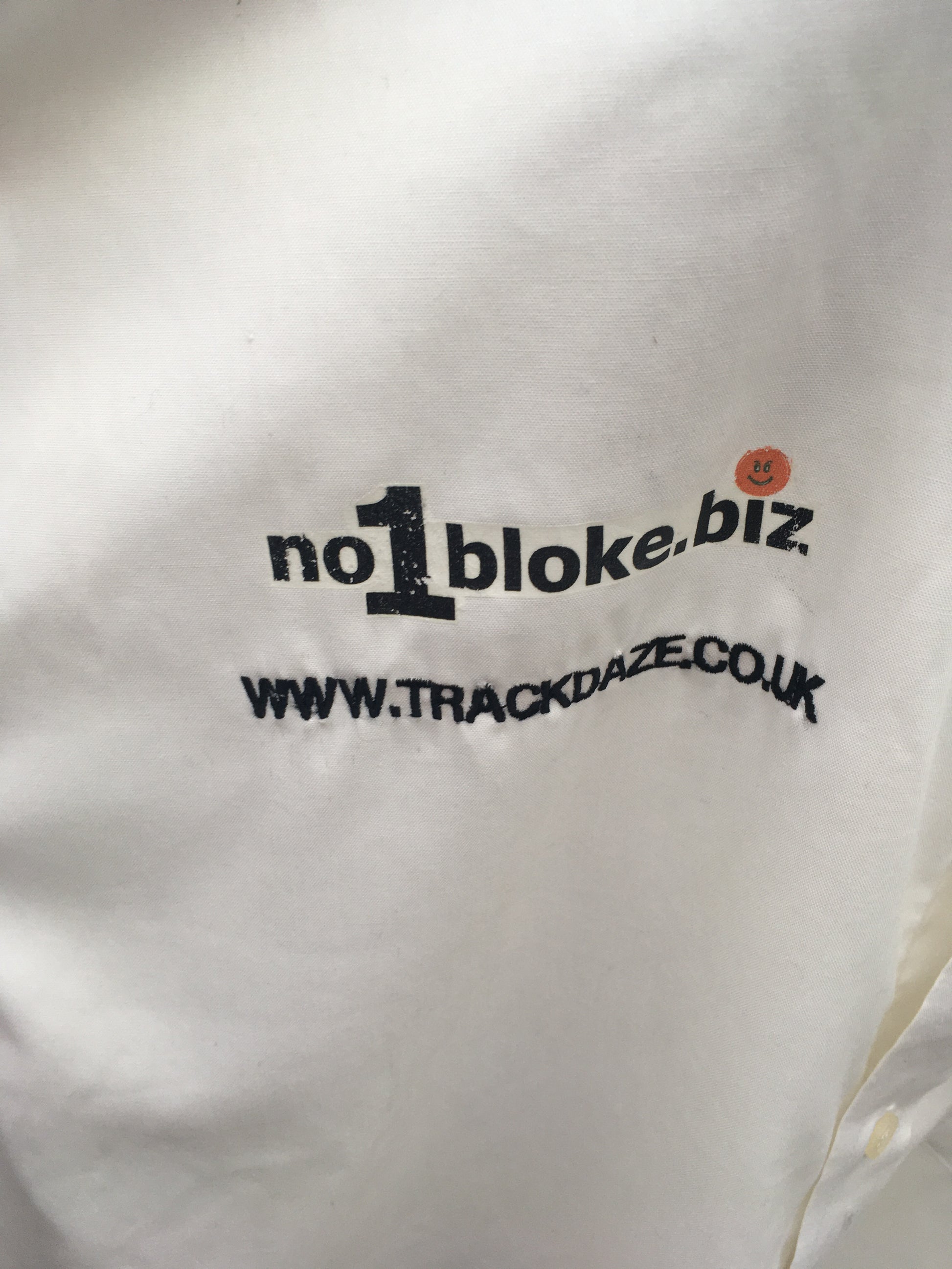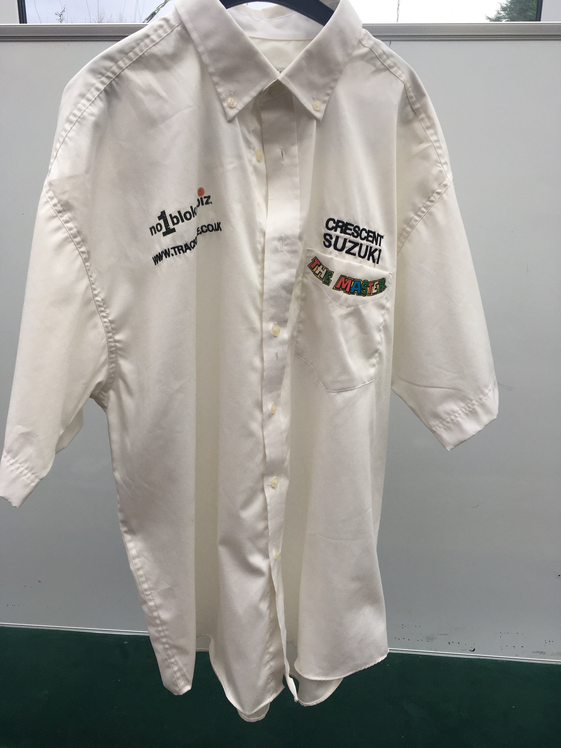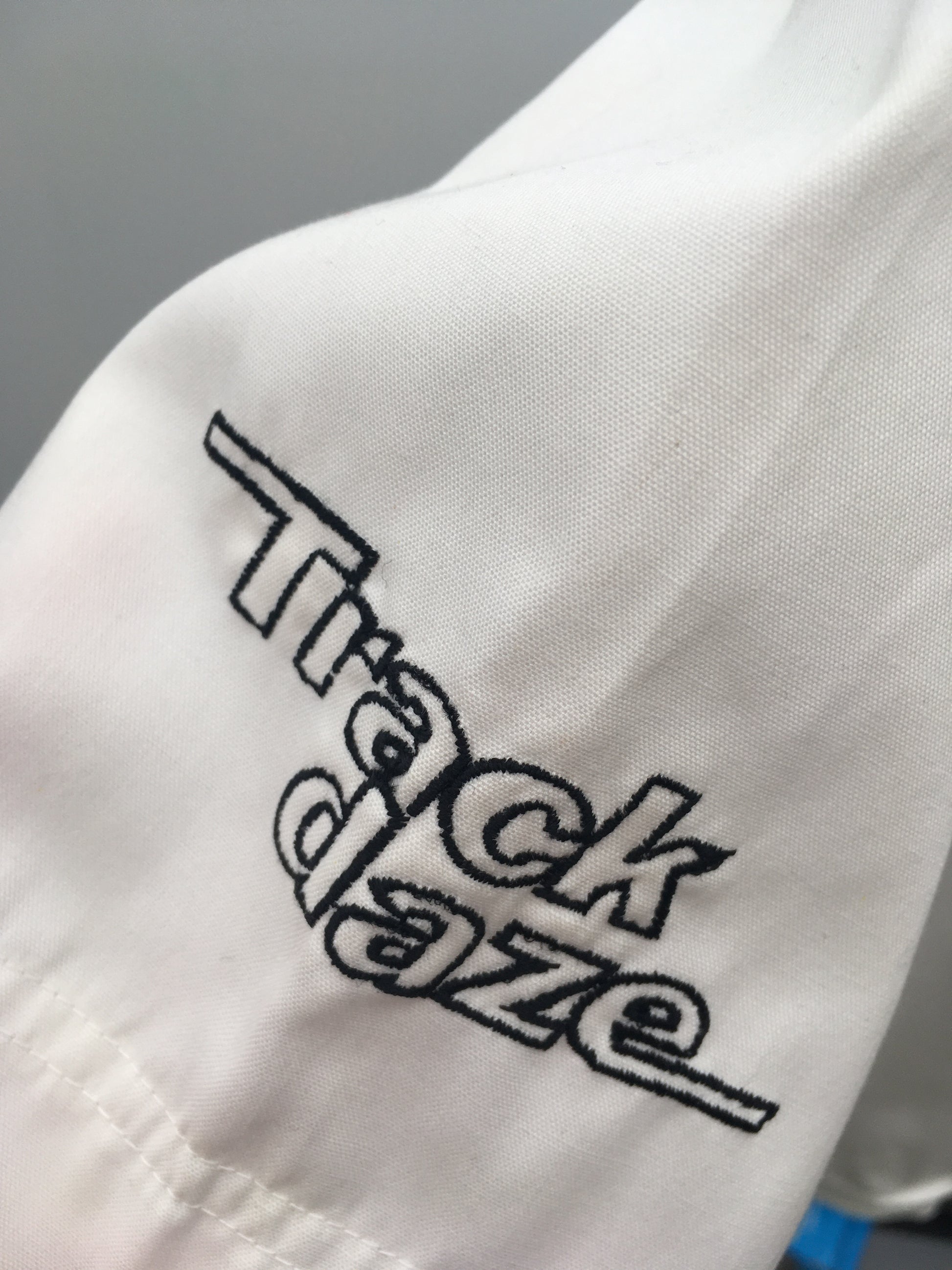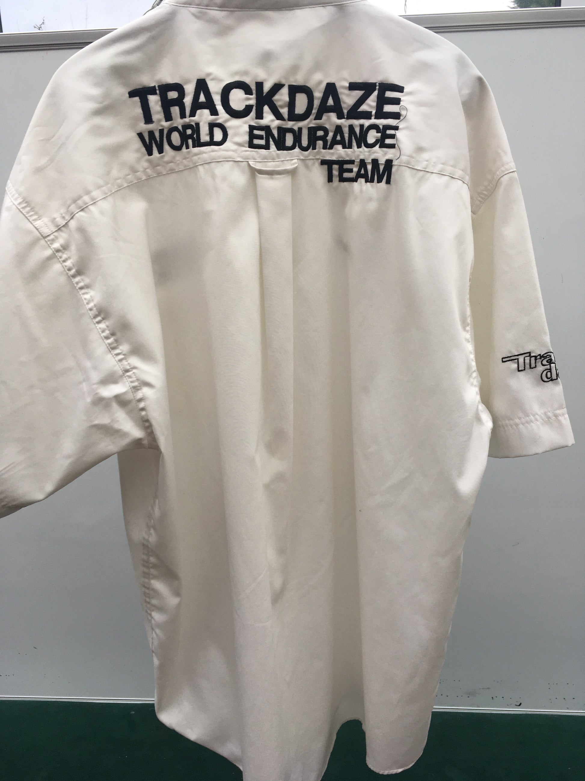 Motorsport memorabilia motorcycle team shirt - TrackDaze Endurance some embroidery of logos is front, collar, back and sleeve, some iron on logos.