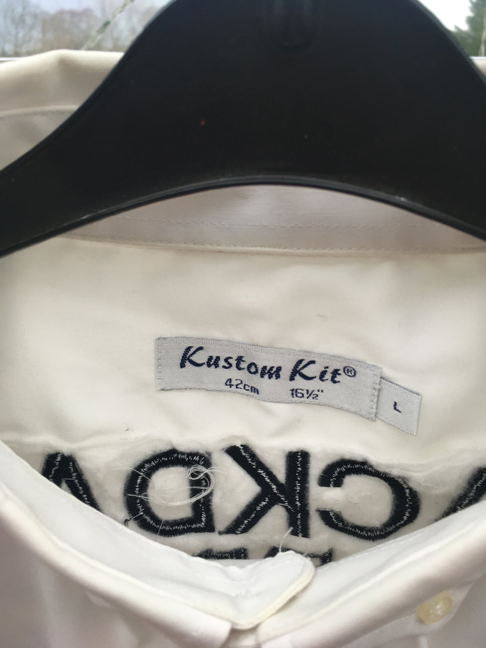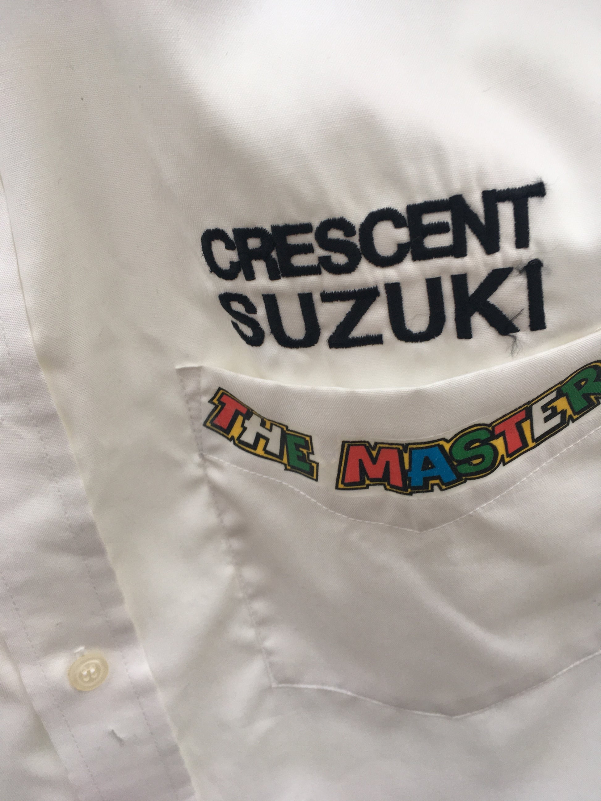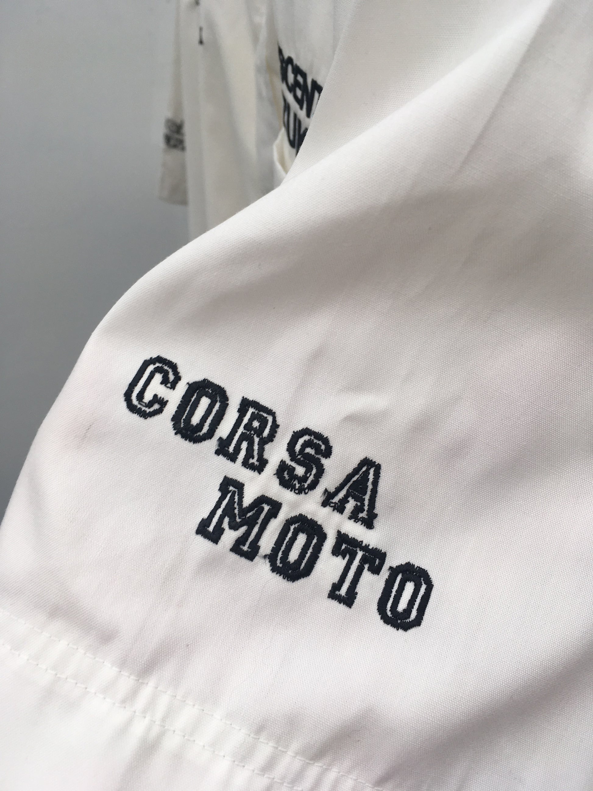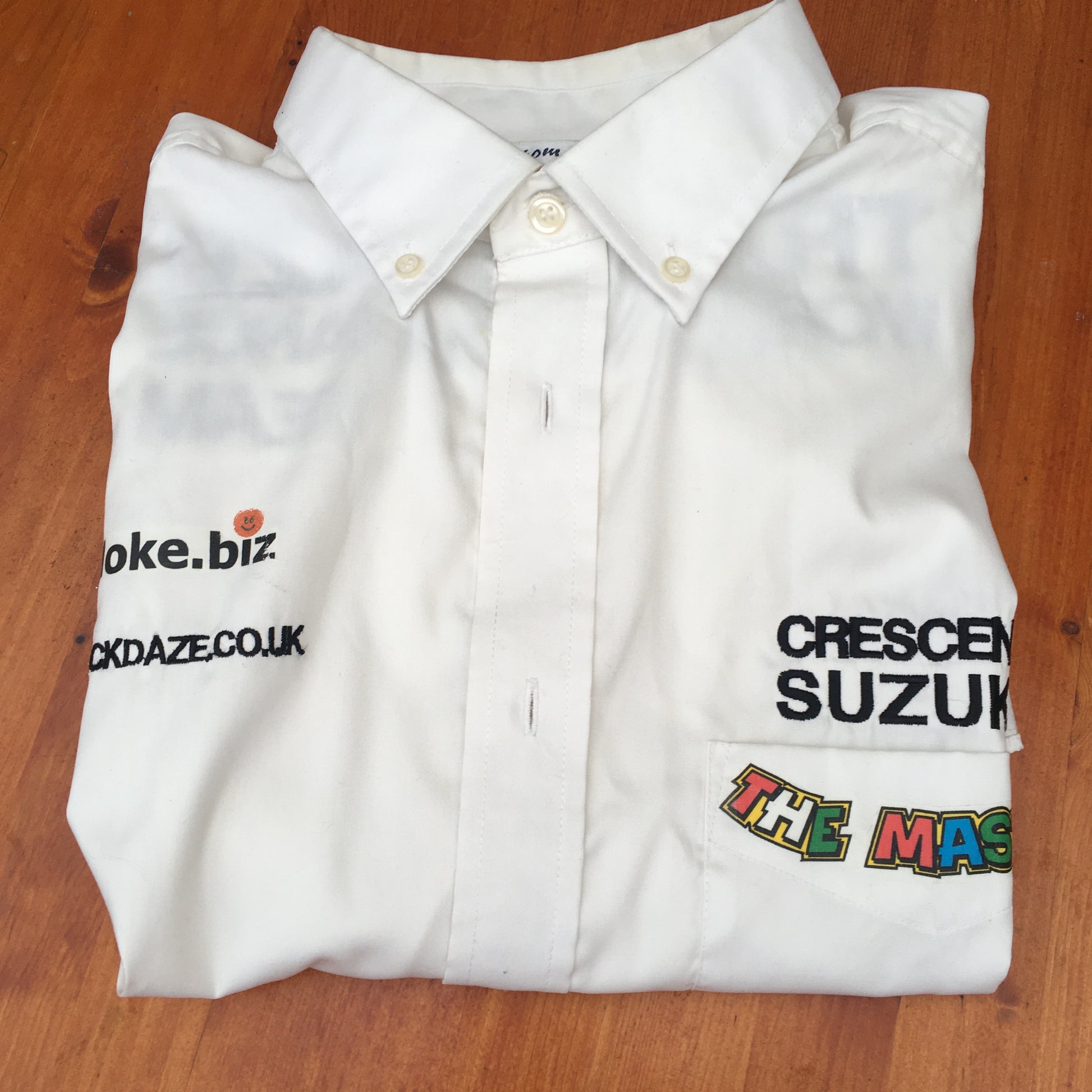 Motorsport memorabilia motorcycle team shirt - TrackDaze Endurance some embroidery of logos is front, collar, back and sleeve, some iron on logos.