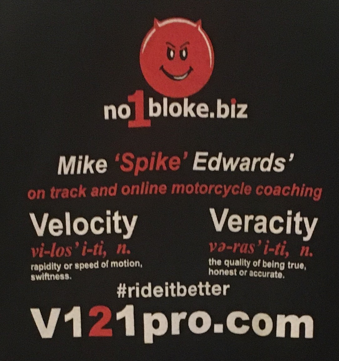 Mike 'Spike' Edwards NEW 'Velocity' 'Veracity' mantra motorcycle coaching V121PRO T shirt.